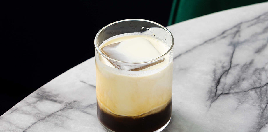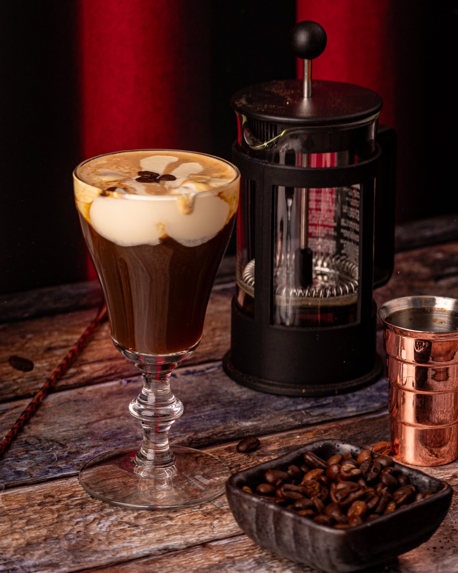 Combine 1st two ingredients over ice & stir, Layer double cream on top